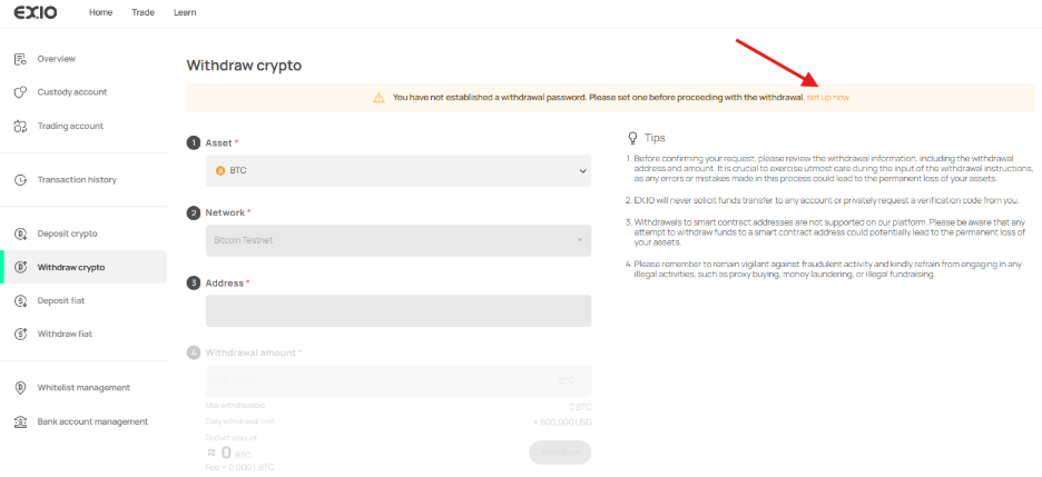 On the “Withdraw crypto” page, locate the orange notification prompting you to create a withdrawal password. Click on the “Set up now” link.