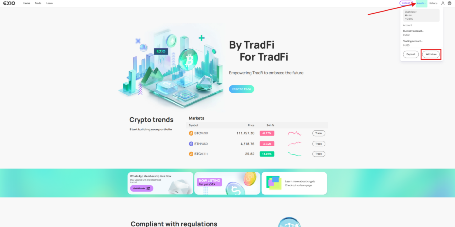 Log in to your verified EX.IO account, hover over “Assets” at the top right of the page and click on “Withdraw”.