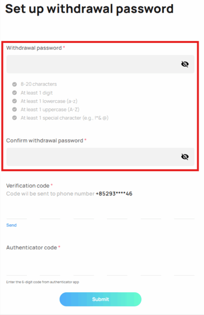 You will be directed to the “Set up withdrawal password” page. Enter your preferred withdrawal password and confirm your withdrawal password.