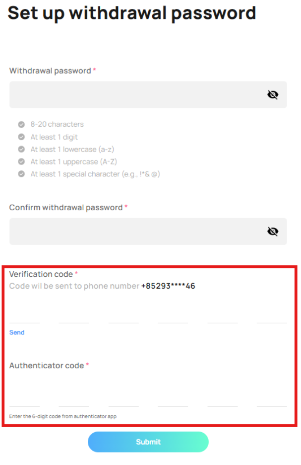After setting up your withdrawal password, verify your account ownership by entering the SMS verification code and 2FA authenticator code.