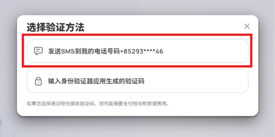 来选择替代验证方法。如果您选择通过短信接收验证码,请注意可能会产生标准短信和数据费用。