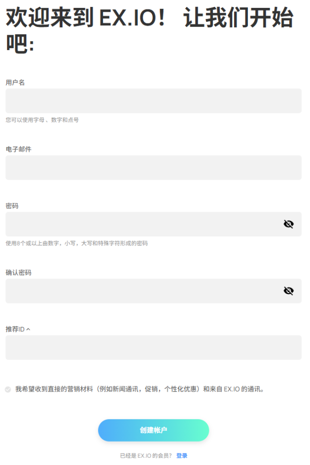 按照指示输入创建账户所需的详细信息,包括创建用户名、电子邮件、密码,以及推荐 ID (如果是由现有 EX. IO 会员推荐 )。然后点击创建账户。