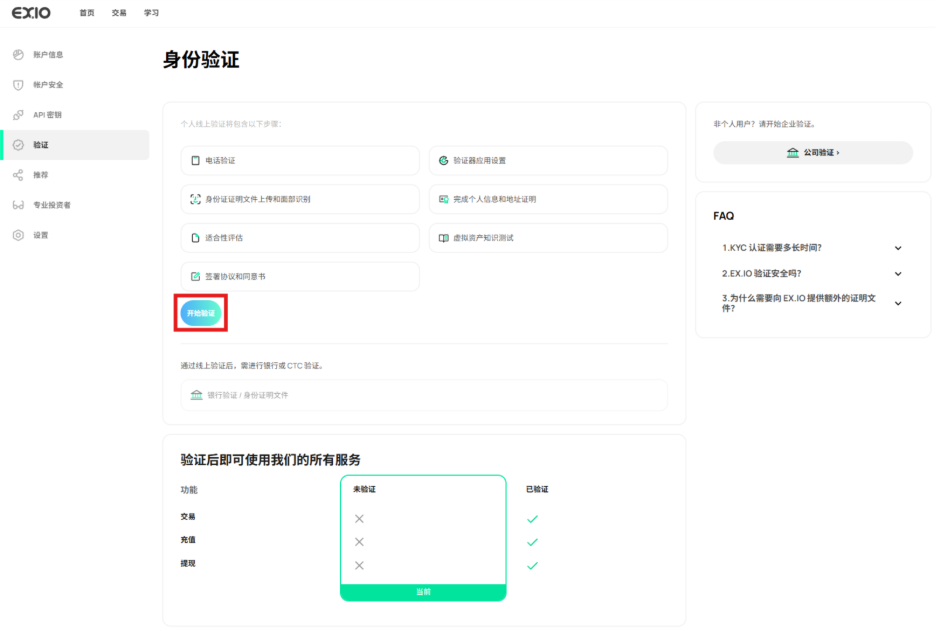 在此页面上,您需要完成身份验证。 请注意,一旦选择了验证的账户类型,无法更改。 点击「开始验证」开始此流程。