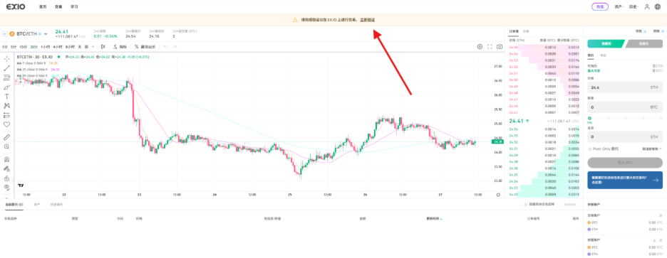 进入账户主页后,您需要完成 KYC(了解您的客户)流程以开始交易。 点击屏幕顶部黄色的「立即验证」标示。