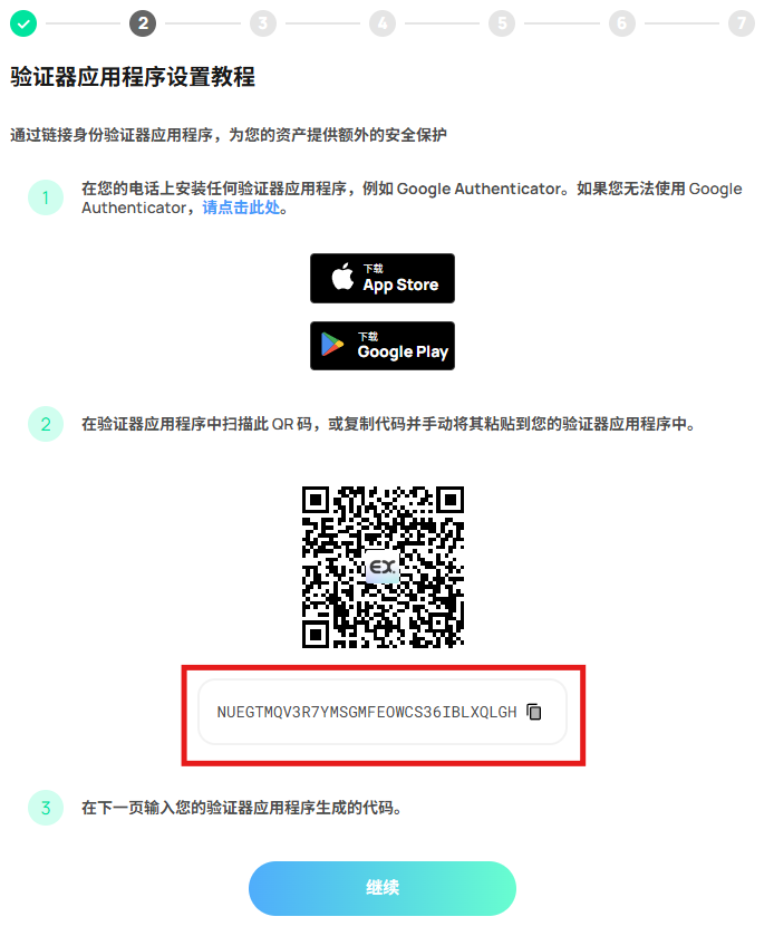 启用您的验证器应用程序,并在应用程序中扫描我们提供的 QR 码。 完成后,在应用程序中点击「继续」。
