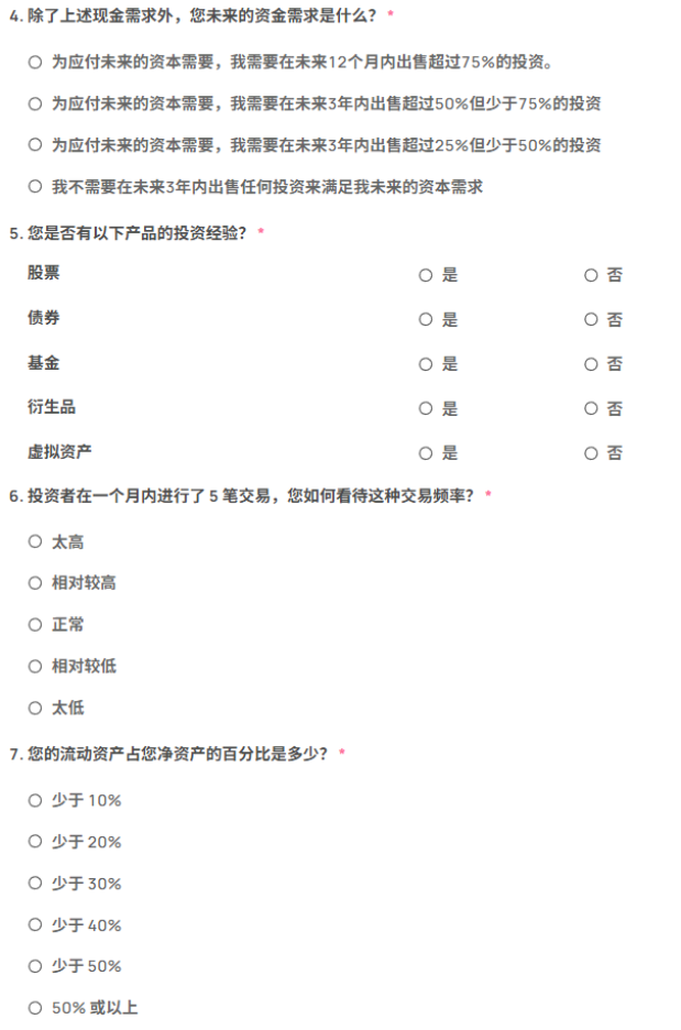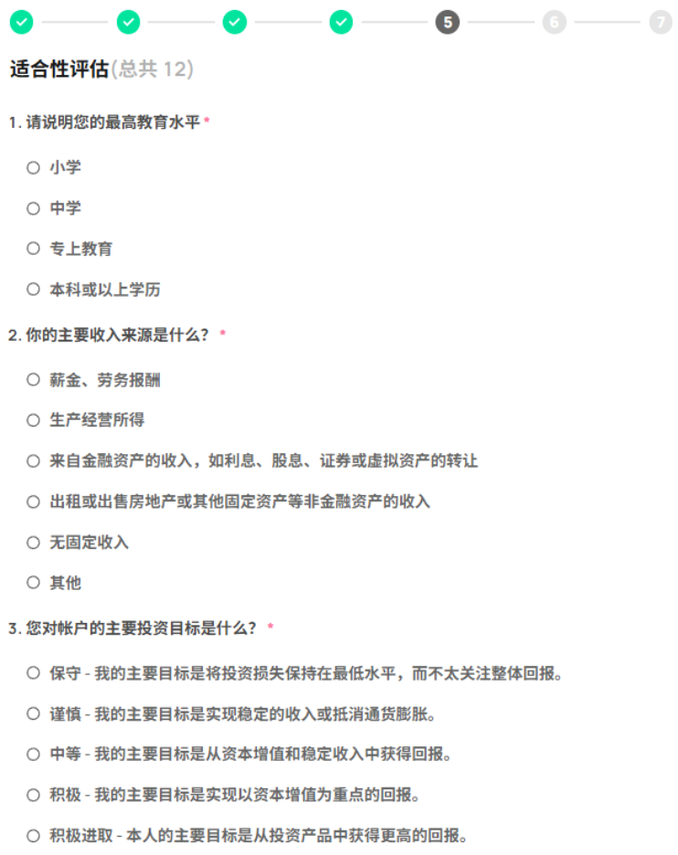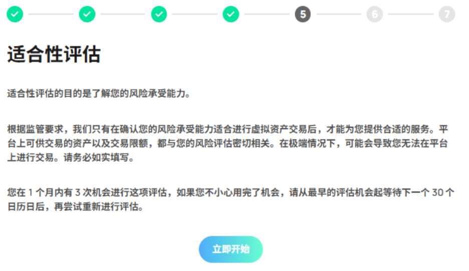 接下来是「适合性评估」,点击「立即开始」开始评估。 然后选择您认为最能反映您风险状况的答案完成评估。 每个月内您只能进行三次评估,如果用完了三次评估机会,请等待距离最早评估机会的 30 天后再次尝试。