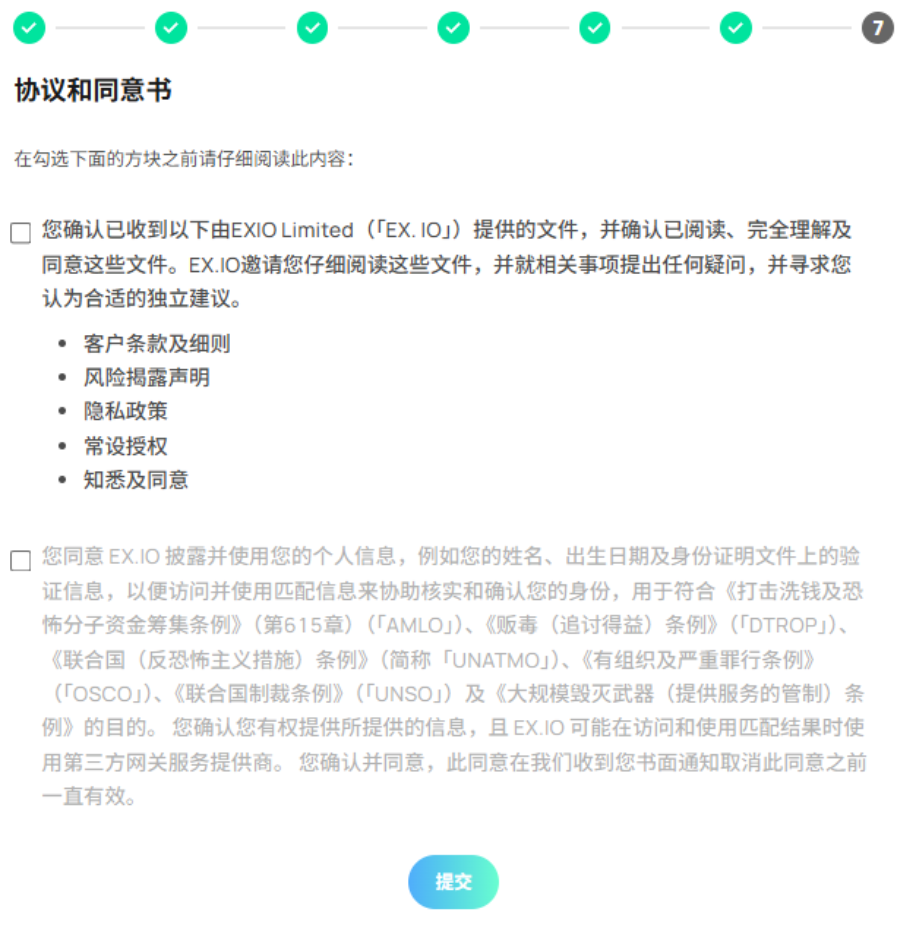 请仔细审阅协议和同意书。 审阅并同意后,勾选相关声名以完成KYC流程。