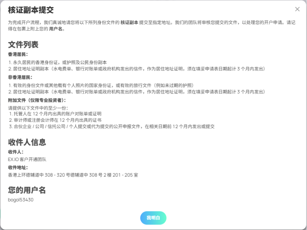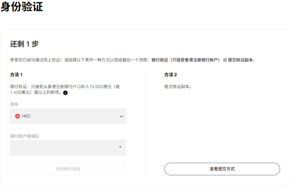 在 EX. IO 开户团队完成审核且无任何问题后,您需要完成最后一步:选择银行验证(仅限香港注册银行账户)或按网站指示将认证文件邮寄至 EX. IO 办公室。
