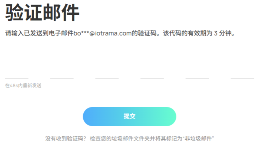 创建账户后,您需要输入通过注册电子邮件箱所收到的验证码,然后点击提交。