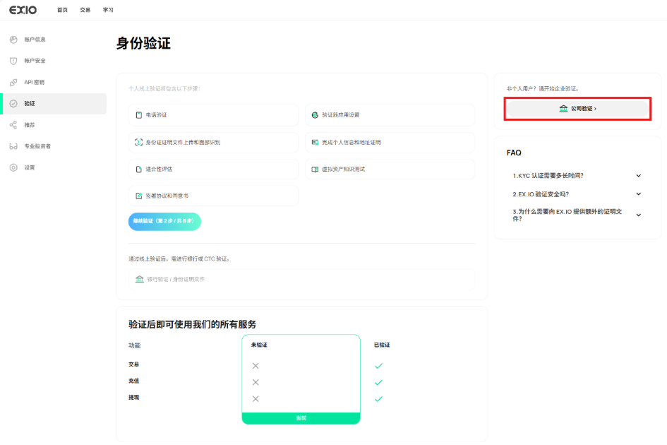 进入账户主页后,您需要完成 KYC(了解您的客户)流程以开始交易。 点击屏幕顶部黄色的「立即验证」标示。