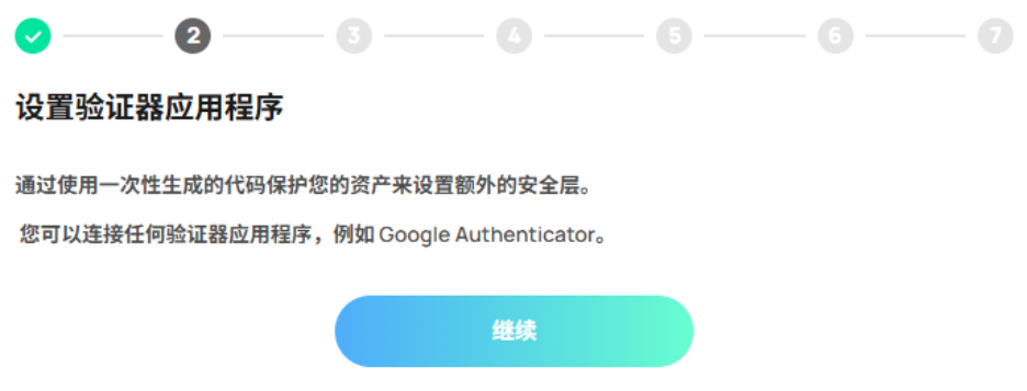 设定验证器应用程序。 首先在你的移动设备上下载一个验证器应用程序(例如 Google Authenticator),然后点击「继续」。