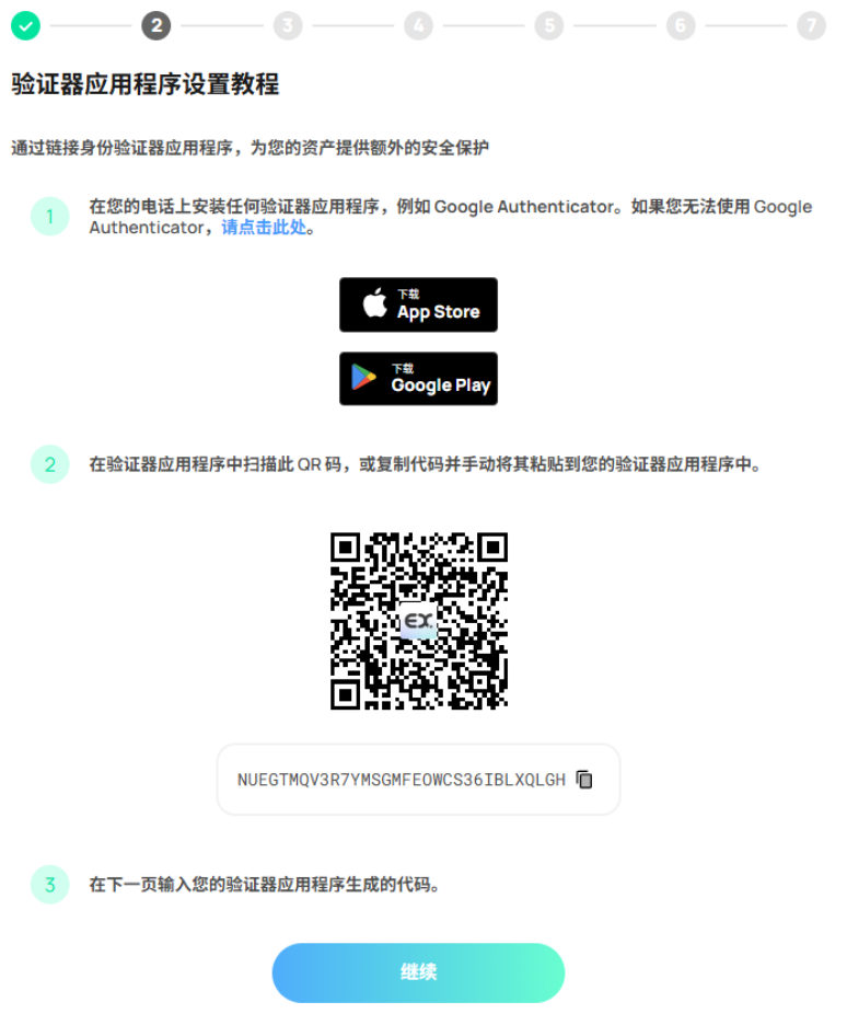 启用您的验证器应用程序,并在应用程序中扫描我们提供的 QR 码。 完成后,在应用程序中点击「继续」。